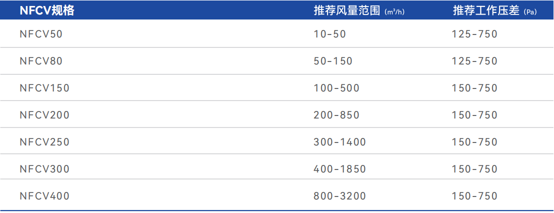 NFCV共7个规格,推荐风量涵盖10-3,200m3/h,适宜中、小风量应用场合。